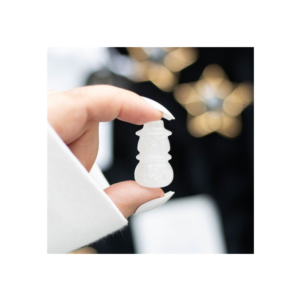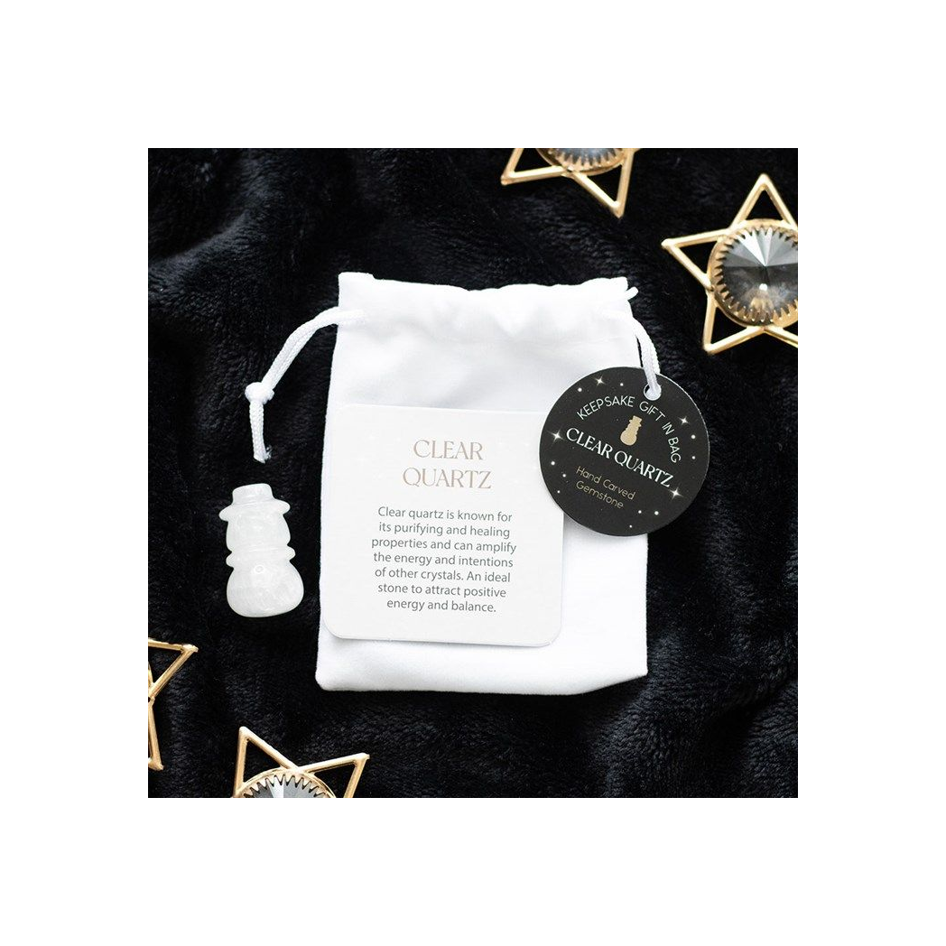 Add a touch of festive magic with this clear quartz crystal snowman in a bag. Hand-carved into an adorable snowman, this gemstone is crafted from clear quartz for attracting positive energy and balance, and for amplifying festive spirits throughout the season. Perfect for decorating or gifting, this unique crystal is kept safely in a matching velvet drawstring bag. As each crystal is unique, stone shape and colour may vary from photos shown.