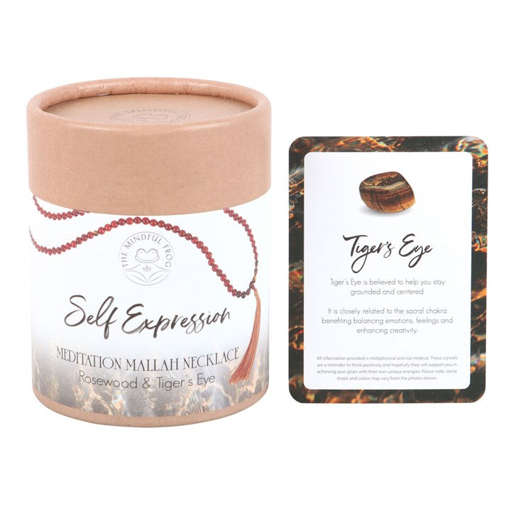 Crafted from rich, warm rosewood beads and interlaced with striking Tiger's Eye stones, this elegant necklace displays 108 beads — a traditional count in Mallah necklaces symbolizing a spiritual journey and mindfulness — and is completed with a decorative tassel. The Tiger's Eye, known for its empowering and protective qualities, is associated with the throat chakra, fostering self-expression and communication. It is believed to enhance confidence, encourage clear thinking, and empower the wearer to speak their truth with clarity and courage. A Mallah, or Mala, necklace is a string of beads traditionally used in meditation and prayer in various spiritual practices including Buddhism and Hinduism. Each bead represents a repetition of a mantra or prayer, aiding in focus and spiritual contemplation. To use simply hold the necklace in one hand and move from bead to bead whilst focusing on mindful breathing and repeating an intention. The necklace can be worn throughout the day as a reminder of these intentions. Each Mallah Necklace is presented in a beautifully designed box, accompanied by a corresponding information card, making it an ideal and thoughtful gift for a loved one who values communication, confidence, and personal growth.